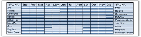 De même, si la région permet de découvrir une faune exceptionnelle, celle ci vraie selon les saisons. Vous trouverez ci dessous un calendrier résumant la présence des baleines, pingouins et autres animaux.